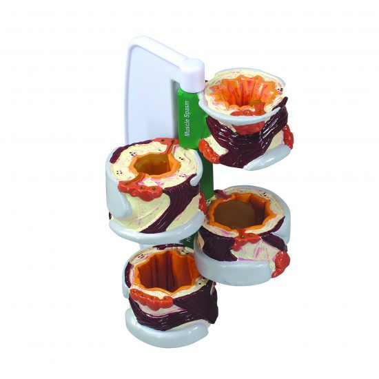 This hinged 4 piece Bronchus Model illustrates the effects of asthma and chronic bronchitis on the bronchus tissue. The four states included are normal bronchus, hypersecretion of mucous, smooth muscle spasm and swelling with lymphoid aggregations.