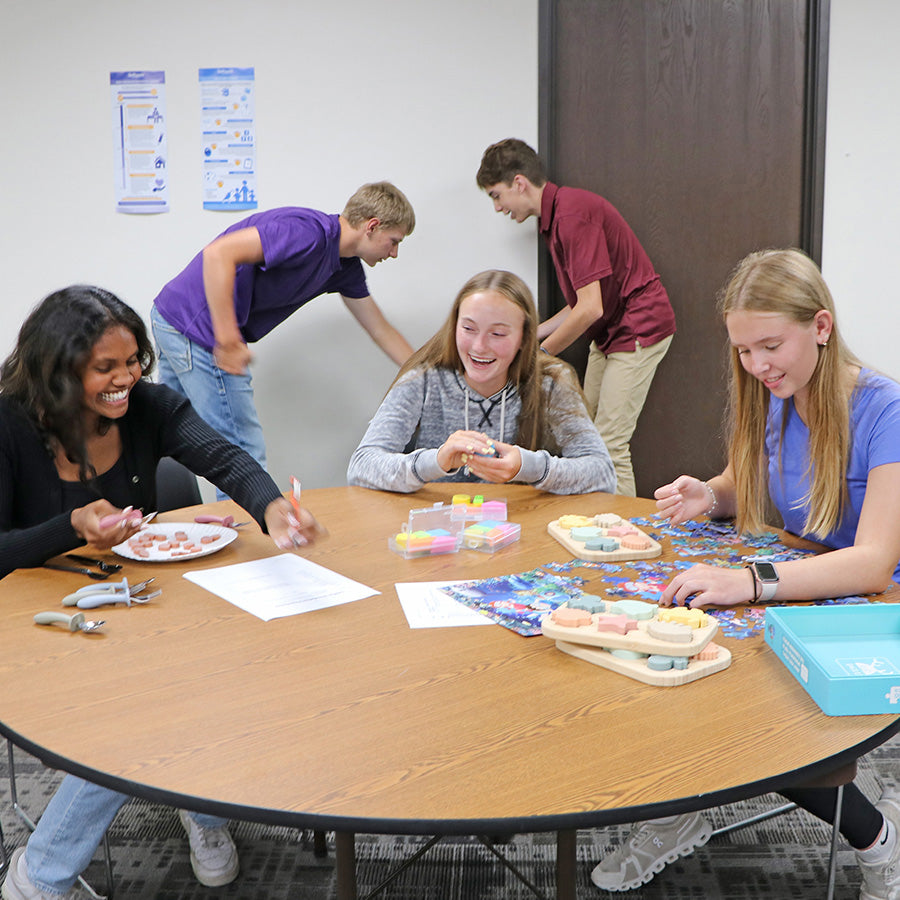 - Interactive materials such as puzzles, sorting shapes, utensils, and jump ropes