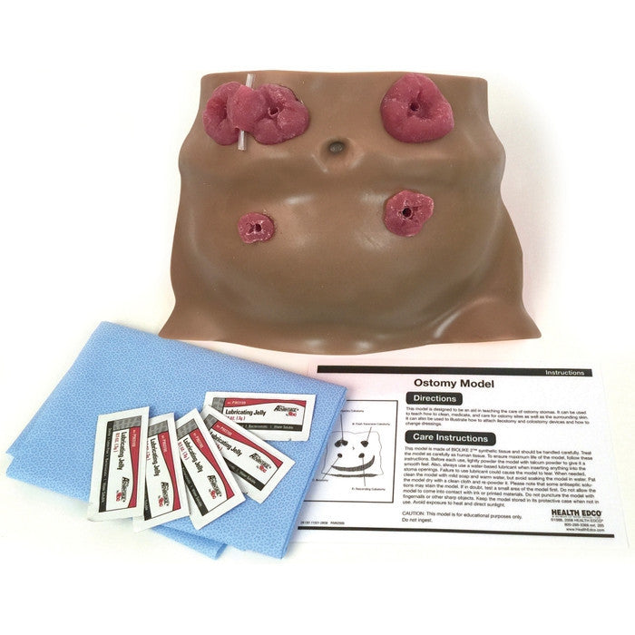 This life-size ostomy care model contains four realistic stomas that can be lubricated and dilated with an inserted finger to teach students how to care for ostomies. The model may be washed, irrigated with a catheter, taped, bandaged, or fitted with ostomy bags. Ileostomy and colostomy devices can also be used with the simulator, and the model can be used to train students in how to change dressings.